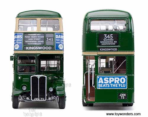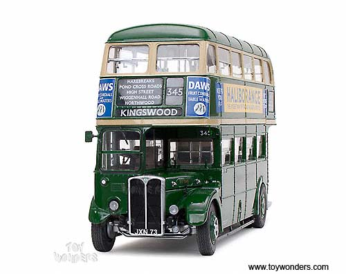 2927 Sun Star - Routemaster Bus - RT1045 - JXN73. 1:24 scale diecast collectible model car. This Routemaster double decker bus is approximately 11" long. Manufactured by SunStar. 2927 is in GREEN color. Individually packed in a box. Box size: 15.75"L x 6.5"W x 9.5"H. It features: