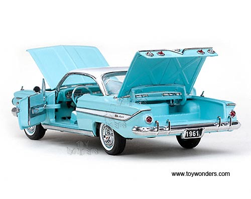 2104 Sun Star USA - 1961 Chevy Impala Sport Coupe Hard Top. 1:18 scale diecast collectible model car. This Chevy Impala is an 11.25"L x 4"W x 2.75"H die-cast metal with openable hood, doors & trunk. Mounted on a display stand. This Chevy Impala is manufactured by Sunstar. GM is a trademark of the General Motors Corporation. U.S.A. Collectibles. Item 2104 is in SEAMIST TURQUOISE POLY color with white roof. Individually packed in a window box. Box size: 14"L x 6.5"W x 5"H.