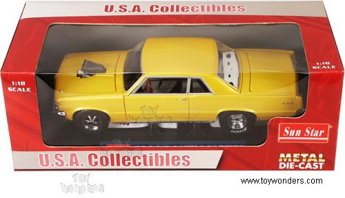 1839YL SUN STAR USA - 1964 Pontiac GTO Hard Top with Engine Blower. 1:18 scale diecast collectible model car. This Pontiac GTO is an 11.25"Lx 4"Wx 3"H die cast car with openable doors, hood & trunk. Turnable front wheels, steering function, detailed interior, engine and chassis. Sits on a display plaque. The Pontiac is manufactured by SunStar. U.S.A. collectilbles. GM is a trademark of the General Motors Corporation. 1839 in METALLIC YELLOW color. Individually packed in a window box. Box size: 14.25"Lx 6.5"Wx 5"H.
