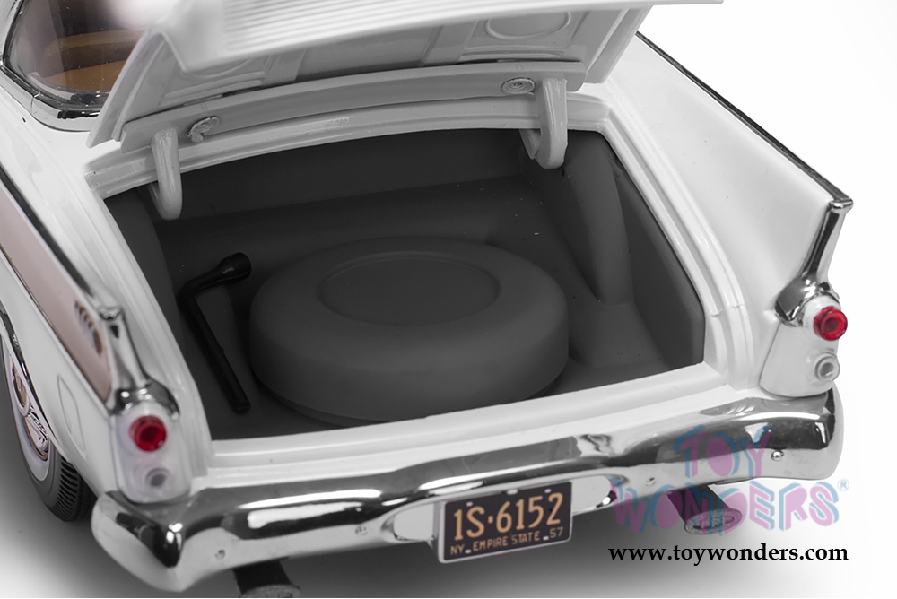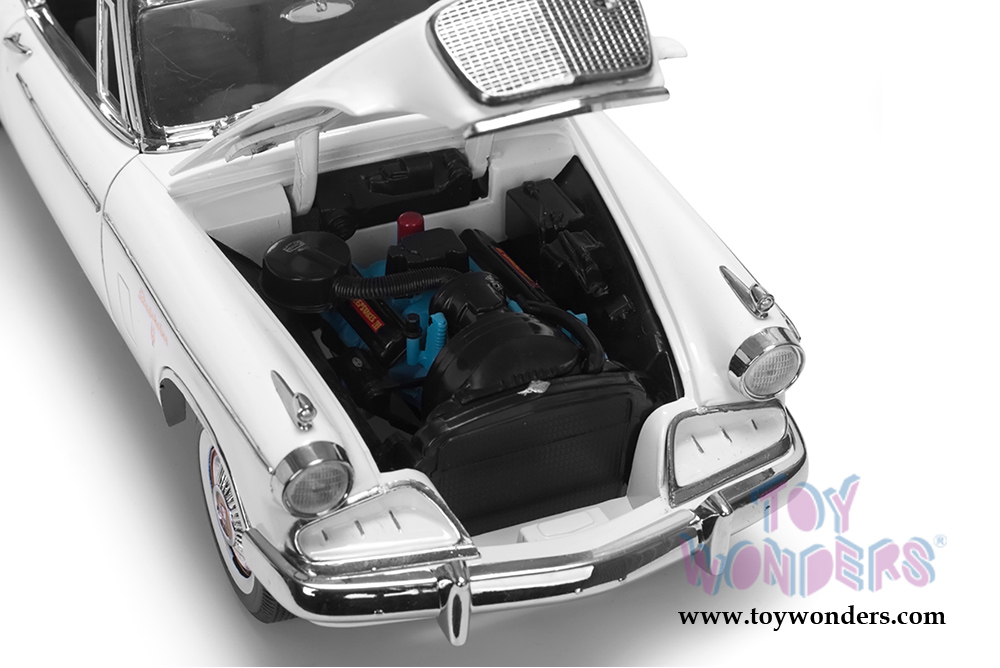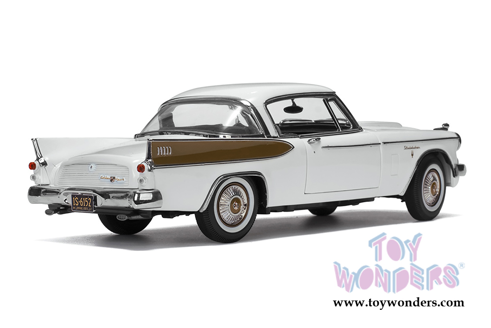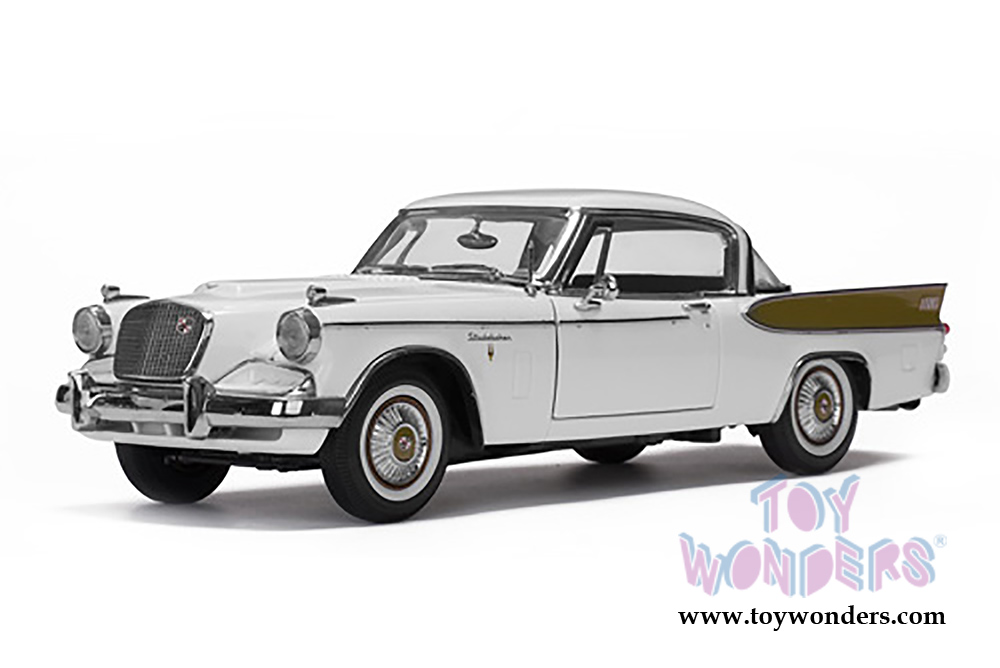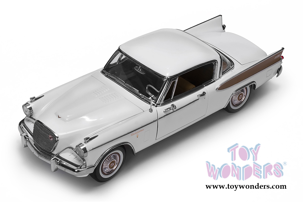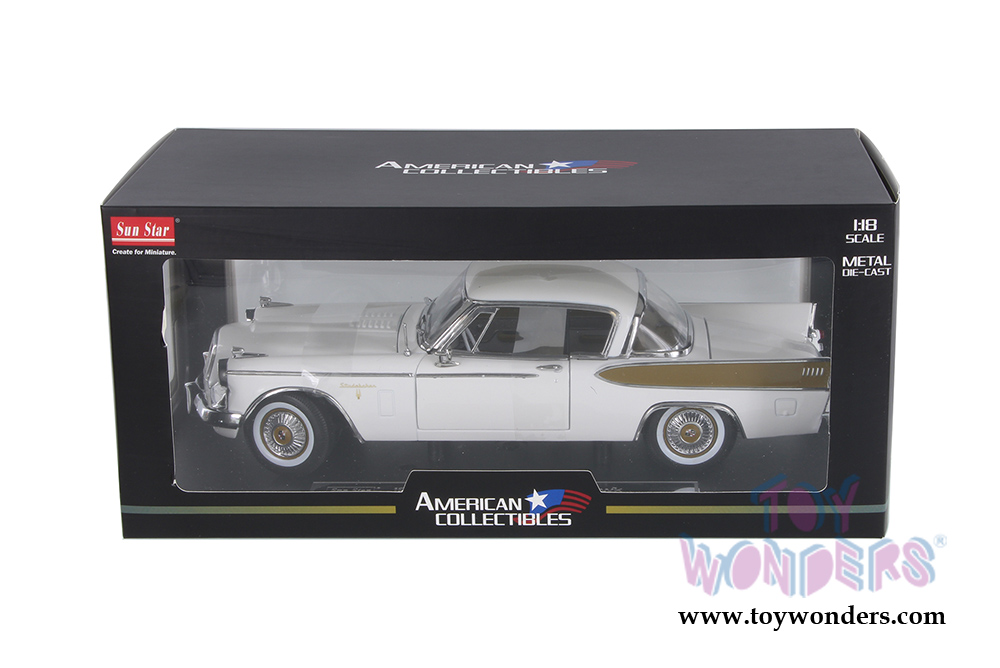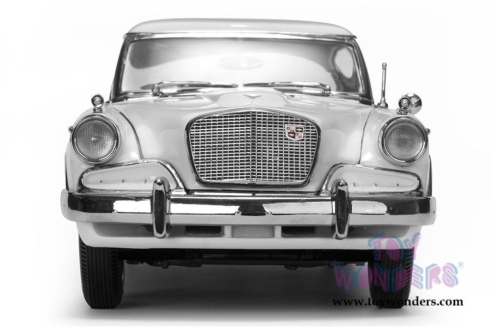 6152 Sun Star USA - 1957 Studebaker Golden Hawk Hardtop. 1:18 scale diecast collectible model car. This Studebaker is an 11"L x 4"W x 3"H diecast car with openable doors, hood and trunk. Turnable front wheels, steering function, detailed interior, engine, and chassis. Sits on a display plaque. This '57 Studebaker is manufactured by Sun Star. U.S.A. collectibles. 6152 is in Arctic WHITE. Individually packed in a window box. Window Box size: 12.5"L x 6.5"W x 5.5"H.
