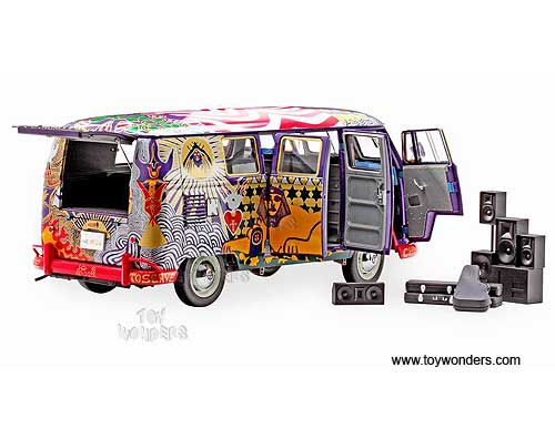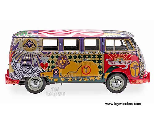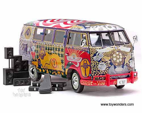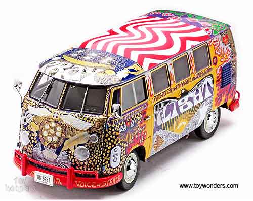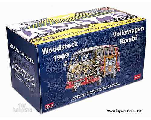 5062 Sun Star - 1969 Volkswagen Kombi Woodstock "Light" Bus. 1:12 scale diecast collectible model car. This VW Kombi bus features openable doors. Limited ediotn 3000 pcs with numbered certificate. This VW Kombi Woodstock Bus is manufactured by SunStar. Individually packed in a box. Box size: 17.25"L x 9.25"W x 9.25"H.