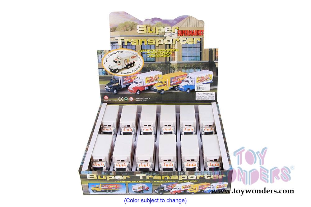 9912FD/MK Super Transporter Box Truck with Farmland Dairies Decals. 5.5" diecast with plastic parts tractor trailer transport truck features with pullback action. 12 pcs per display box in white with decals. 72 pcs per inner box.