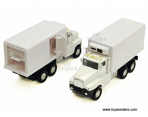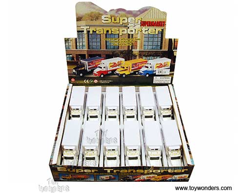 9912/3RW Super Transporter with Refrigerator. This tractor trailer is a 5.5"L x 1.75"W x 2.5"H diecast model with pullback action, openable sliding rear door and trunk side door. 12 pcs per display box in WHITE color. 72 pcs per inner box.