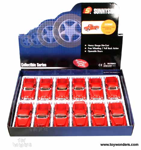 5602DR Superior - 1955 Chevy 3100 Stepside Pick-up Truck. 1:36 scale diecast collectible model car. This 1955 Chevrolet Stepside pickup truck is a 5.25"Lx 2.1"Wx 2"H die cast metal car with free wheeling. This 55 Chevy pick up truck also has openable doors & tailgate. Manufactured by Superior/ Sunnyside. 12 pcs per display box. 48 pcs per inner box. 5602D in RED color. GM is a trademark of the General Motors Corporation.