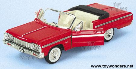 8711D 1964 Chevrolet Impala Convertible. 1:24 scale diecast model car. This 1964 Chevy Impala is 8.5" diecast, free wheel, convertible is a classic 64 Impala with openable doors & hood. This 1964 Chevrolet Impala measures 8.5"Lx 3.25"Wx 2.5"H. Superior; Sunnyside. 4 pcs per display box. 8711 in assorted colors. GM is a trademark of the General Motors Corporation.