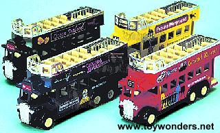 5855D City Tour Bus. 5" diecast metal free wheel double decker city tour bus in assorted colors. This double decker bus measures 2" in height. Manufactured by Superior; Sunnyside. 6 pcs per display box. 48 pcs per inner box.