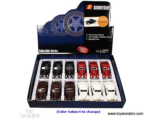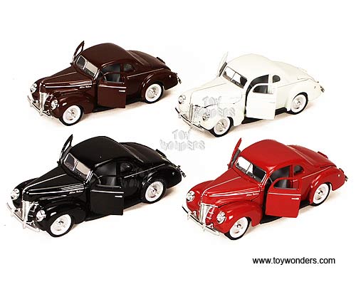 5740D Superior - 1940 Ford Deluxe 5-Window Coupe. 1:34 scale diecast collectible model car. This 1940 Ford Coupe is a 5.5" long free-wheeling die cast metal classic with openable doors & hood. This 40 Ford Coupe is manufactured by Superior/ Sunnyside. 12 pcs per display box and in assorted colors. 48 pcs per inner box. Z8
