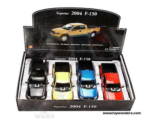 9607D Superior - 2004 Ford F-150 Pickup Truck. 1:24 scale diecast model car. This F150 pick-up is 9.5" long diecast metal pick up truck with opening doors/hood and workable steering. Superior/ Sunnyside. 4 pcs per display box in assorted colors.