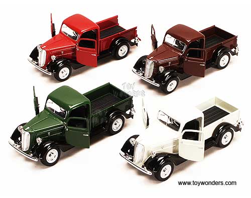 5607D/8 Suuperior - 1937 Ford Pick-Up Truck. 1:34 scale diecast collectible model car. This 1937 Ford is a 5.75"Lx 2"Wx 2.25"H diecast metal free wheel pick up truck with openable doors & tailgate. This 37 Ford pickup truck is manufactured by Superior/ Sunnyside. 12 pcs per display box in assorted colors. 48 pcs per inner box. Z8.