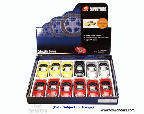 5733D Superior - 1996 Porsche Boxster Convertible. 1:30 scale diecast collectible model car. This 1996 Porsche Boxster is a 5.5" long die cast metal sports car with pullback motor action and openable doors & hood. This 96 Porsche is manufactured by Superior/ Sunnyside. 12 pcs per display box and in assorted colors. 48 pcs per inner box. Z8