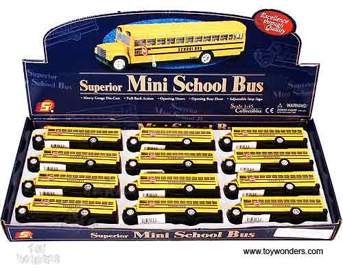 6851D Superior - School Bus. 1:45 scale diecast model. This yellow schoolbus is a 6"L x 1.5W x 1.5"H diecast collectible metal with openable front & rear doors, moveable stop sign, and pullback motor action. This school bus is manufactured by Superior/ Sunnyside. 12 pcs per display box. 48 pcs per inner box. Z8