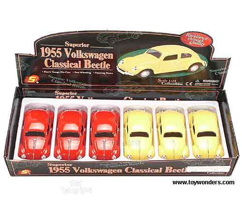 7707D Superior - 1955 Volkswagen Classic Beetle. 1:24 scale diecast model. This 1955 Volkswagon buggy is a 5.5" long diecast metal classic with free wheeling and opening doors. This 55 VW bug is manufactured by Superior/Sunnyside. 6 pcs per display box. 36 pcs per inner box. 7707 in assorted colors.