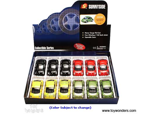 5743D Superior - Volkswagen New Beetle Hard Top. 1:32 scale diecast collectible model car. This VW Buggy is a 5" long diecast metal VW New Beetle with pullback motor action and openable doors & hatchback. This Volkswagen Bug is manufactured by Superior/ Sunnyside. 12 pcs per display box and in assorted colors. 48 pcs per inner box.