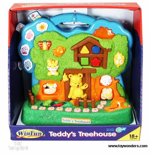 12209E Battery Operated Teddy's Treehouse. This treehouse features interactive with animals, numbers, shapes, weather conditions, music and nursery rhumes; 5 learning activity modes (animal/ number/ shape recognition, weather conditions, find it game, memory game, party game and music); 10 number flower pads convert to a 10 note keyboard; 8 melodies with different instrument and animal mixing sound effects; Built-in handle. For ages 18 months and up. Requires 2 "AA" batteries (included). Box size: 12"Lx 7"Wx 11.5"H.