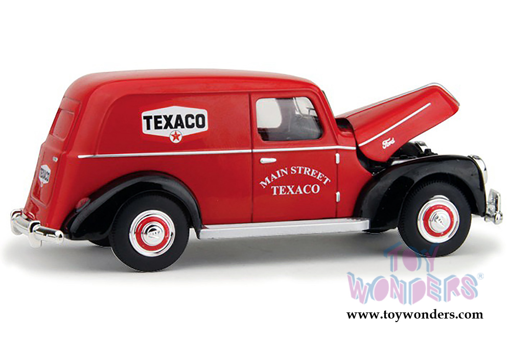 0611R Texaco - Texaco 1940 Ford Ford Panel Van. 1:32 scale diecast collectible model car. This 1940 Texaco Ford Tanker is a 5"L x 1.75"W x 2"H die-cast metal car. It features opening hood, detailed interior, exterior, engine compartment and custom graphics. Individually packed in a window box. Box size: 6.75"Lx 2.5"Wx 3.25"H. Item 0611R is in RED color with Black fenders.