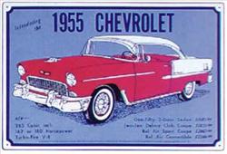 T-66 1955 Chevy nostalgic tin sign. Collector metal signs. A collection of yesterday's signs. Great for decorating homes, offices, restaurants, etc. Lithographed steel metal. This Chevrolet tin sign is mounted on a black 20" x 16" card. T66