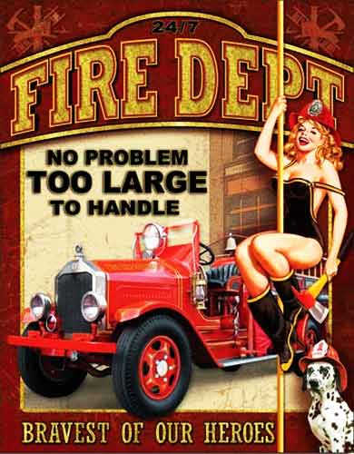 CD-1720 Fire Dept - No Problem nostalgic tin sign. Collector metal signs. A collection of yesterday's signs. Great for decorating homes, offices, restaurants, etc. Lithographed steel metal. Mounted on a black 20" x 16" card. CD1720