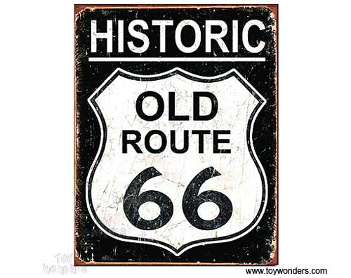TD-1938 Tin Sign:Historic Old Route 66 Weathered Sign. Rt 66 Collector metal signs. A collection of yesterday's signs. Great for decorating homes, offices, restaurants, etc. Lithographed steel metal. Mounted on a black 20" x 16" card. TD1938