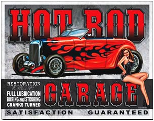 TD1626 Hot Rod Garage Nostalgic tin sign. Collector metal signs. A collection of yesterday's signs. Great for decorating homes, offices, restaurants, etc. Lithographed steel metal. TD1626. Mounted on a black 20" x 16" card.