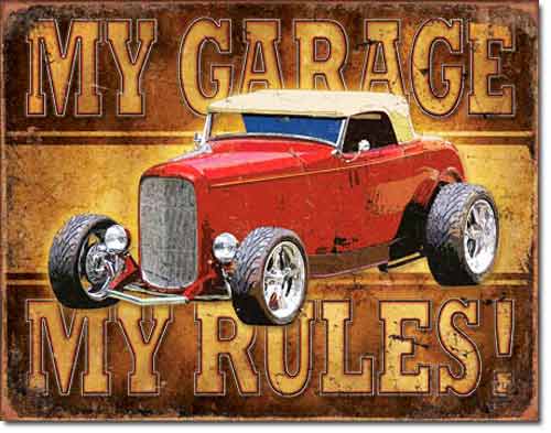 CD1761 My Garage My Rules! - Road tin sign. Collector metal signs. A collection of yesterday's signs. Great for decorating homes, offices, restaurants, etc. Lithographed steel metal. Tin Sign size is 16"W x 12.5"H. Mounted on a black 20" x 16" card. CD1761.