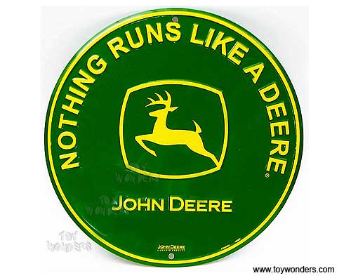 RD-54 Nothing Runs Like A Deere Green nostalgic round tin sign. John Deere Collector metal signs. A collection of yesterday's signs. Great for decorating homes, offices, restaurants, etc. Lithographed steel metal. RD54 measures 12" diameter. This tin sign is shrink wrapped on to a 12.5" x 19" piece of cardboard for protection during transport.