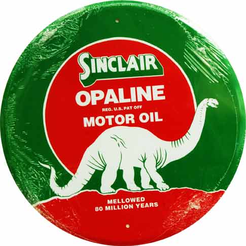 RD-25 Sinclair Opaline Motor Oil nostalgic round tin sign. Collector metal signs. A collection of yesterday's signs. Great for decorating homes, offices, restaurants, etc. Lithographed steel metal. RD25 measures 12" diameter. This tin sign is shrink wrapped on to a 12.5" x 19" piece of cardboard for protection during transport.