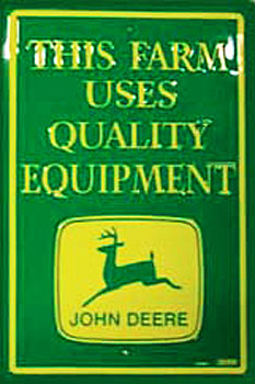 M-352 This Farm Uses Quality Equipment John Deere nostalgic tin sign. Collector metal signs. A collection of yesterday's signs. Great for decorating homes, offices, restaurants, etc. Lithographed steel metal. M352 measures 12" x 18". This tin sign is shrink wrapped on to a 19" x 12.5" piece of cardboard for protection during transport.