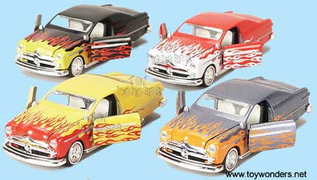 18028D 1949 Ford Coupe Custom Rod Hard Top. 1:36 scale diecast model car. This 1949 Ford Coupe is a 5.25" long diecast with pullback motor action. This 49 Ford Coupe also has openable doors. Tins' Toys. 12 pcs per display box and in assorted colors.