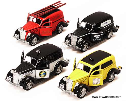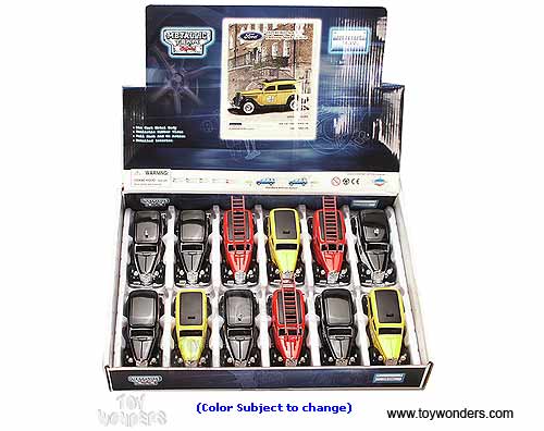 18026D Tins' Toys - 1935 Ford Sedan Delivery. 1:38 scale diecast collectible model. This Ford Sedan Delivery is a 5"L x 2"W x 2"H die-cast with pullback motor action and openable doors. This Ford Sedan Delivery is manufactured by Tin's Metal. 12 pcs per display box in assorted colors. 48 pcs per inner.
