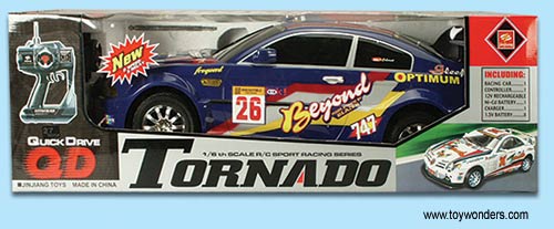 8838BU Tornado Racing Car. 1:6 scale. 28"Lx11.5"Wx8"H radio control car with factory assembled, front & rear suspension with coil spring shock units, semi-proportaional right & left steering plus forward & reverse, sealed gear box, two speeds selectable wheel & trigger type transmitter included, working headlights, and moveable side mirror. AC adaptor & battery pack included. BLUE only.