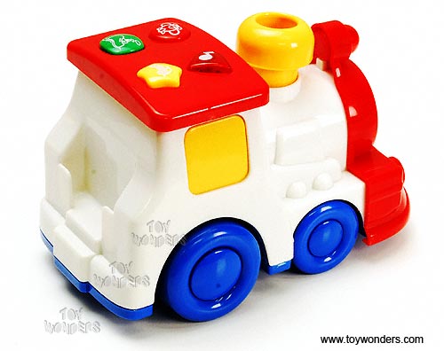7030 Touch & Go Talking Vehicle w/ Lights & Sounds. This Talking Locomotive Train features different buttons with different functions (flashing lights, moving, and teaching different shapes & sounds). Includes 2 "AA" batteries. Box size: 7.5"L x 5"W x 5.5"H. For 18 months and up. 18 pcs per inner.