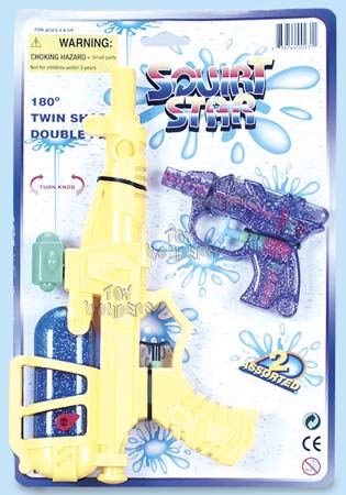 8231 Twin Shot Double Pack. Includes a small 4.5" water gun and a large 10.75" gun that has a non-pressurized tank and a second nozzle that can rotate left or right to provide a 2nd simultaneous shot. Blister card is 13" x 8.5". Assorted colors. Spring toy. Inner box: 12 pcs.