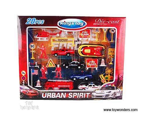 5722P/1 Urban Spirit Fire & Police Play Set. 20 pcs. Emergency vehicle playset includes fire truck, helicopters, police cars, road signs, figures, traffic cones, US flag, and more. Box size: 14.5"Lx 11.75"Wx 1.5"H.