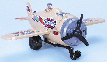 1291 War Fighter, 9" long, battery operated classic World War I era fighter plane with flashing light and moving propeller. The plane rises, simulates take-off action, spins around, and simulates landing. Requires 2 AA batteries not included. Individually boxed. Box size: 9.5" L x 9.25"W x 4.75"H.