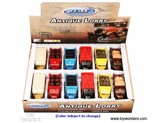 99350AD Welly - Antique Lorry. 1:34 - 1:39 scale diecast collectible model car with openable doors. Pull back action. Those antique lorries are 4.75"L x 1.75"W x 2"H. Manufactured by Welly. 12 pcs per display box in assorted colors and styles. 72 pcs per inner box.