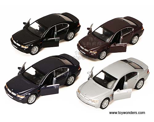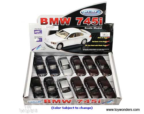 49763D Welly - BMW 745i Hard Top. 1:34 - 1:39 scale diecast collectible model car. This BMW 745i is a 4.75"Lx 1.75"Wx 1.5"H die cast metal car with openable doors and pull back action. This BMW 745i is manufactured by Welly. 12 pcs per display box in assorted colors. 72 pcs per inner box.