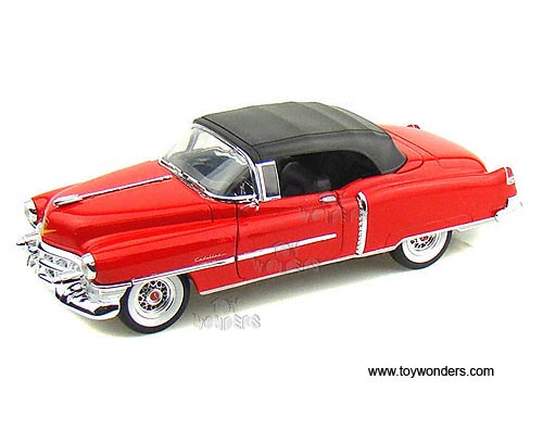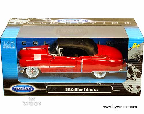 22414 Welly - 1953 Cadillac Eldorado Soft Top. 1:24 scale diecast collectible model car. This Cadillac Eldorado is a 7.75"L x 3"W x 2.25"H diecast metal car with free wheeling, and openable doors & hood. Individually packed in a window box WB. Box measures 9"L x 4.25"W x 4"H. This 1953 Cadillac Eldorado is manufactured by Welly. Item 22414 is in RED color. 6 pcs per inner. GM is a trademark of the General Motors Corporation.