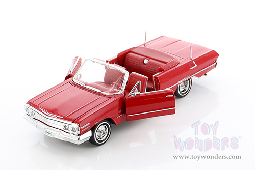 22434LR/4D Welly - 1963 Chevy Impala Convertible. 1:24 scale diecast collectible model. This Chevrolet Impala is an 8"L x 3"W x 2"H die cast with openable doors & hood. This 63 Chevy Impala is manufactured by WELLY. 4 pcs per display box and in RED color. 16 pcs per inner box. GM is a trademark of the General Motors Corporation.