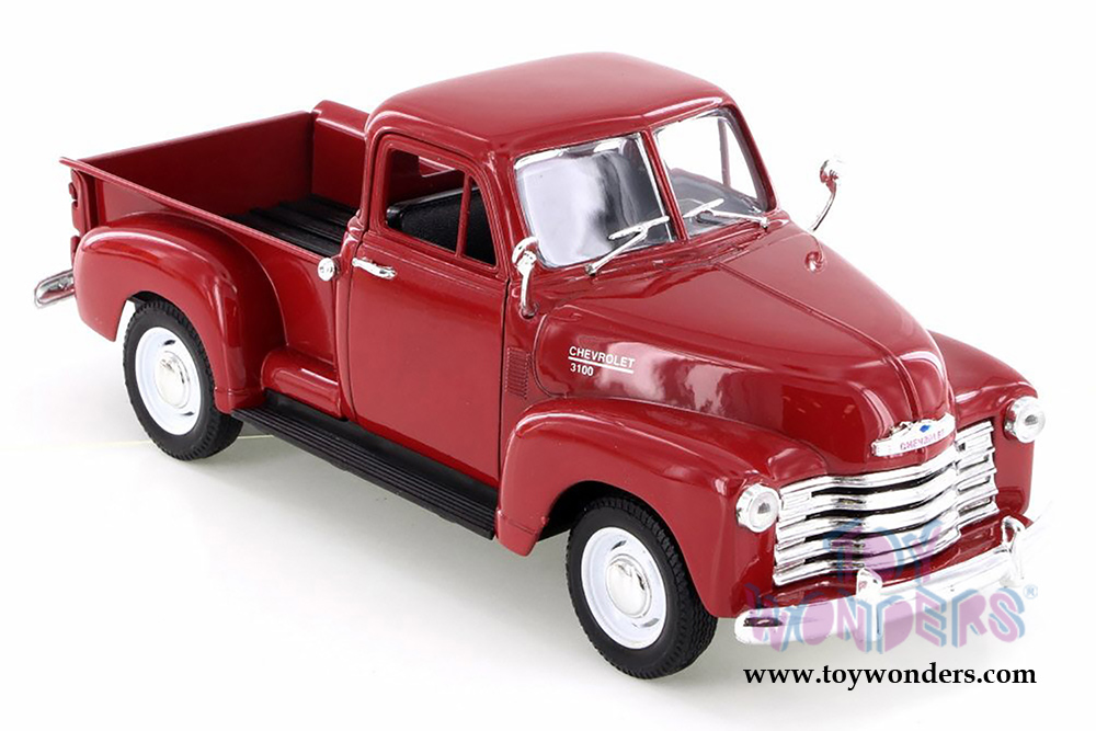 22087WR Welly - 1953 Chevrolet® 3100™ Pickup Truck. 1:24 scale diecast collectible model car. This Chevrolet 3100 Pick-up Truck is an 8"L x 3"W x 3"H diecast metal car with free wheeling, openable doors & tailgate. Individually packed in a window box WB. Box measures 9"L x 4.25"W x 4"H. This 1953 Chevy® 3100™ Pick up is manufactured by Welly. Item 22087WR is in RED color. 6 pcs per inner. GM is a trademark of the General Motors Corporation.