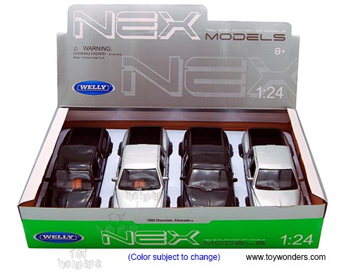 22076/4D Welly - 1999 Chevy Silverado Extended Cab Pickup Truck. 1:24 scale (1/24 scale) diecast collectible model. This Chevrolet Silverado pick-up truck is an 8"L x 2.75"W x 2.5"H die cast with openable doors & tailgate. This 99 Chevy Silverado Pick up is manufactured by WELLY. 4 pcs per display box and in assorted colors. 24 pcs per inner box. GM is a trademark of the General Motors Corporation.