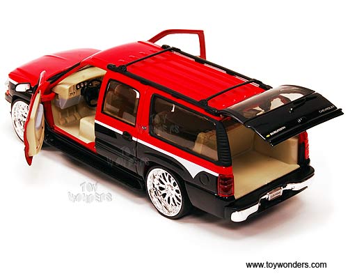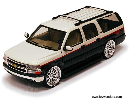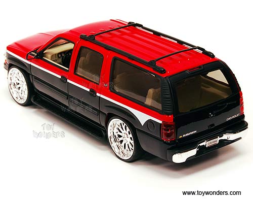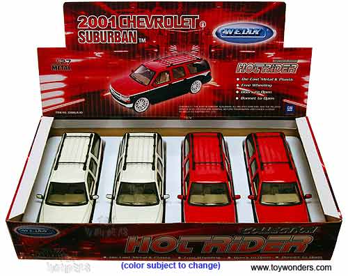 22090LR/4D Welly - 2001 Chevy Suburban SUV. 1:24 scale diecast collectible model. This Chevrolet Suburban is an 8"L x 3"W x 2.5"H die cast with openable doors & hatchback. This 01 Chevy Suburban sports utility vehicle is manufactured by WELLY. 4 pcs per display box and in assorted colors. 16 pcs per inner box. GM is a trademark of the General Motors Corporation.