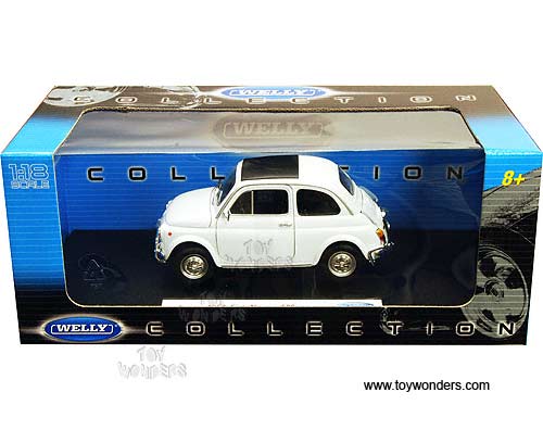 18001 Welly - 1957 Fiat Nuova 500 Hard Top. 1:18 scale diecast collectible model car. This Fiat Nuova 500 is a 6.25"Lx 2.5"Wx 2.75"H diecast collection car with openable doors, hood & trunk. It features steerable front wheels, detail components, and is mounted on a display plaque. This Fiat Nuova 500 is manufactured by Welly. 18001 is in WHITE color. Individually packed in a window box. Box size: 13"Lx 6.25"Wx 5.25"H.