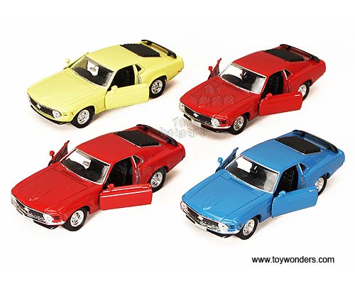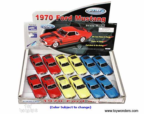49767D Welly - 1970 Ford Mustang Hard Top. 1:39 scale diecast collectible model car. This 1970 Ford Mustang is a 4.75" long diecast metal car with opening doors and pullback motor action. This 70 Ford Mustang is manufactured by Welly. 12 pcs per display box and in assorted colors. 72 pcs per inner box.