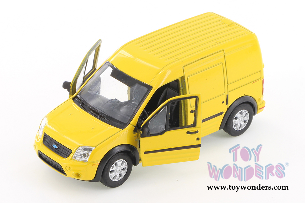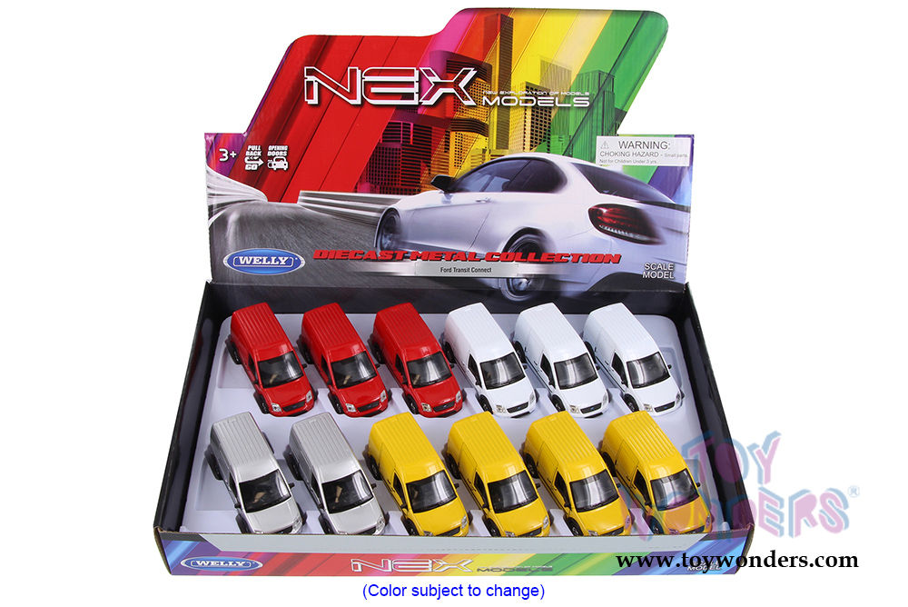 43631D Welly - Ford Transit Connect Minivan. 4.5" diecast collectible model car. This Ford Transit Connect Minivan is a 4.5"Lx 2"Wx 2"H diecast metal car with openable doors and pull back motor action. This minivan is manufactured by Welly. 12 pcs per display box and in assorted colors. 72 pcs per inner box. Z12