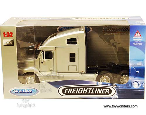 32610W Welly - Freightliner Century Class S/T Tractor Trailer. 1:32 scale diecast collectible model. This Freightliner Century Class S/T is a 10.25"L x 2.75"W x 4.5"H diecast metal with plastic parts and openable hood & doors. This Freightliner Century Class S/T is manufactured by Welly. Individually packed in a window box. Box size: 11.5"L x 4.75"W x 6"H. 32610W is in SILVER color.