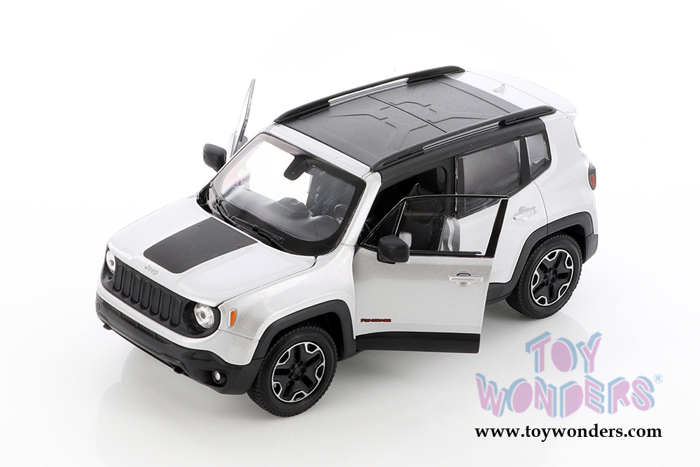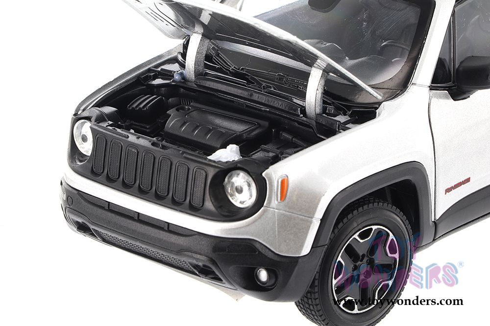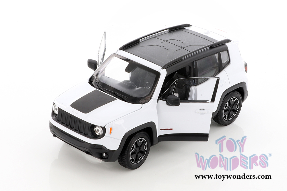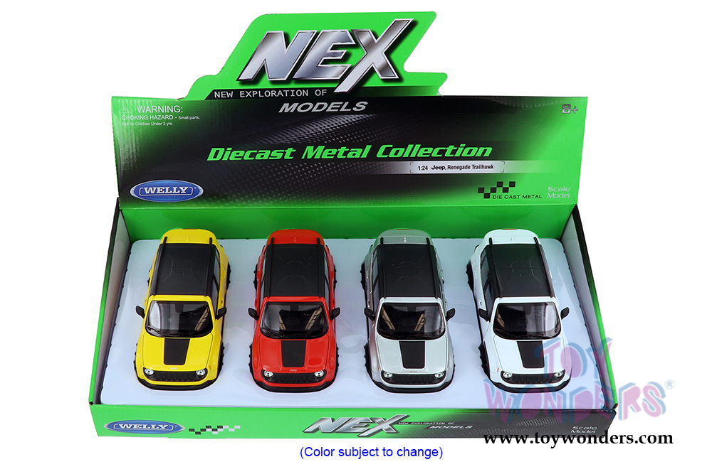 24071/4D Welly - Jeep® Renegade Trailhawk. 1:24 scale diecast collectible model car. This Jeep® Renegade is a 7"L x 3"W x 3"H, diecast metal car with freewheeling, openable doors and hood. Detailed interior, exterior, engine compartment. This Jeep® Renegade Trailhawk is manufactured by Welly. 4 pcs per display box in assorted colors. 24 pcs per inner.