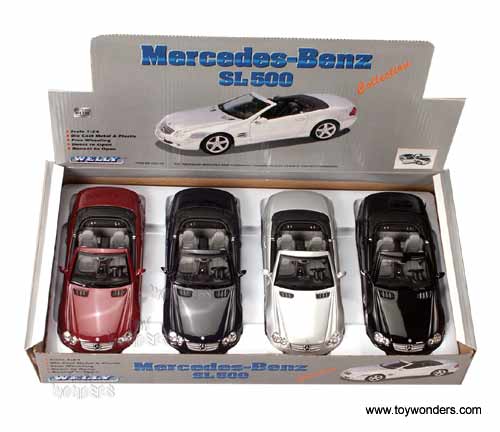 2437/4D Mercedes Benz SL500 Convertible. 1:24 scale diecast model car. This Mercedes SL500 is a 7.5"L x 3"W x 2"H diecast metal convertible with free wheel and openable doors & hood. This Benz is manufactured by Welly. 4 pcs per display box and in assorted colors. 24 pcs per inner box.