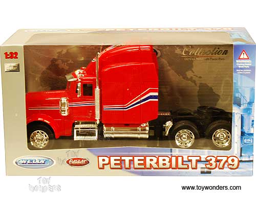 39940 Welly - Peterbilt 379 Tractor Trailer. 1:32 scale diecast collectible model. This Peterbilt 379 is a 10"L x 3.25"W x 4.5"H diecast metal with plastic parts and openable doors. This Peterbilt 379 is manufactured by Welly. Individually packed in a window box. Box size: 11"L x 4.5"W x 6"H. 39940 is in RED color.
