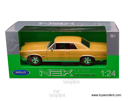 22092WG Welly 1965 Pontiac GTO Hardtop. 1:24 scale diecast model car. This 1965 Pontiac GTO is a 7.75"L x 2.75"W x 2.25"H diecast metal classic muscle car with freewheeling, openable doors and hood. This 65 Pontiac GTO is manufactured by Welly. Item 22092WG is in GOLD color. 6 pcs per inner.