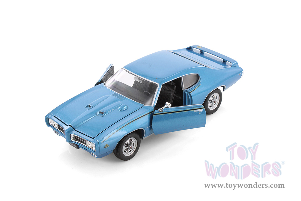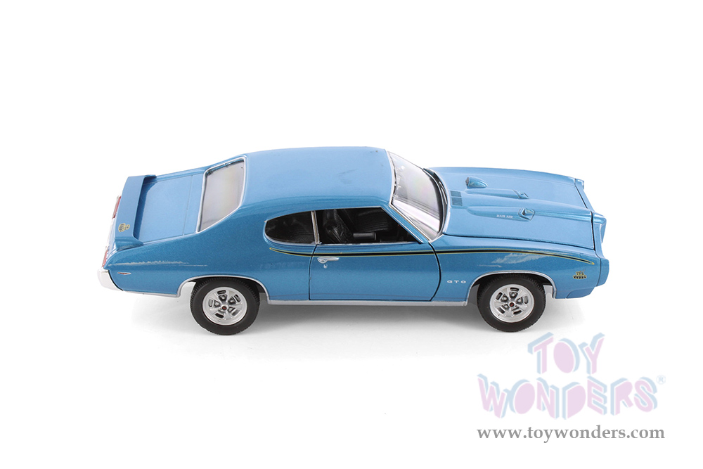 22501WBU Welly - 1969 Pontiac® GTO™ Hardtop. 1:24 scale diecast collectible model car. This Pontiac® GTO™ is a 7.5"L x 2.75"W x 2.25"H diecast metal car with freewheeling, openable doors and hood. This 69' Pontiac® GTO™ is manufactured by Welly. Individually packed in a window box. Box measures 9"L x 4.25"W x 4"H. Item 22501WBU is in BLUE color. 6 pcs per inner box.